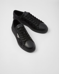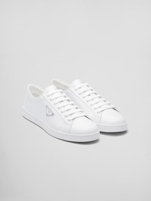 These sleek, sporty sneakers are made of leather and nylon, creating an unexpected contrast in texture. Made with a special tonal technique, the shoes are decorated with a pattern inspired by the iconic Symbole motif. This product does not contribute to the SEA BEYOND educational program. - Product code: 2EE376_3LNW_F0002_F_G000 - With metal eyelets and cotton laces - Upper with enameled metal triangle logo - Rubber box sole - Sole height: 25 mm - Removable leather-covered insole - Imported MATERIALS Fabric/Leather