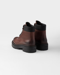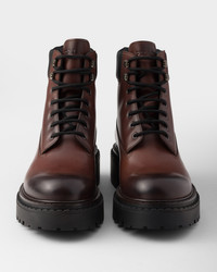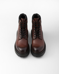 These leather work boots with a functional design and refined details have Re-Nylon elements and are completed by chunky rubber soles that give the footwear structure and a comfortable fit. - Product code: 2TE205_3G21_F0192_F_G001 - Metal eyelet and hook closure - Hot-stamped logo - Chunky rubber sole with double welt - Lug tread - Heel height 60 mm - Leather insole - Imported MATERIALS Fabric/Leather