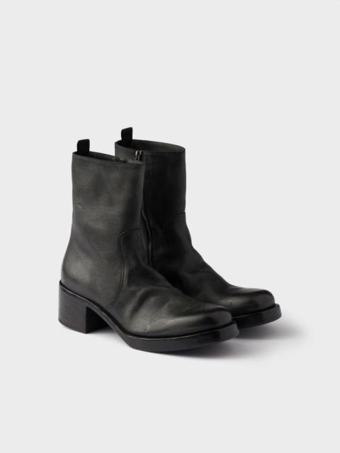 Balancing structure and fluidity, these booties reinterpret the bold style of '70s footwear with contemporary lines and innovative details. Unusual combinations define the distinctive design, characterized by a round toe with emphasized volumes that ends in a slim boot leg. The aged leather gives depth and uniqueness to the footwear, an expression of an authentic and instinctive style. - Product code: 2UE032_MJ0_F0491_F_X000 - With zipper - Boot leg: 20 cm - Leather sole with rubber half-sole and heel layer with hot-stamped logo - Sole height 57 mm - Leather insole - Imported MATERIALS Main material: Calfskin