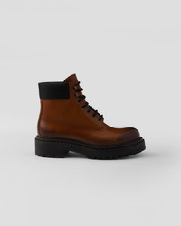 These leather work boots with a functional design and refined details have Re-Nylon elements and are completed by chunky rubber soles that give the footwear structure and a comfortable fit. - Product code: 2TE205_3G21_F0046_F_G001 - Metal eyelet and hook closure - Hot-stamped logo - Chunky rubber sole with double welt - Lug tread - Heel height 60 mm - Leather insole - Imported MATERIALS Fabric/Leather