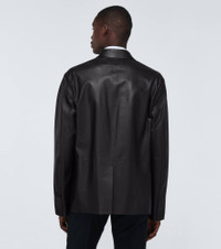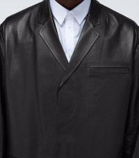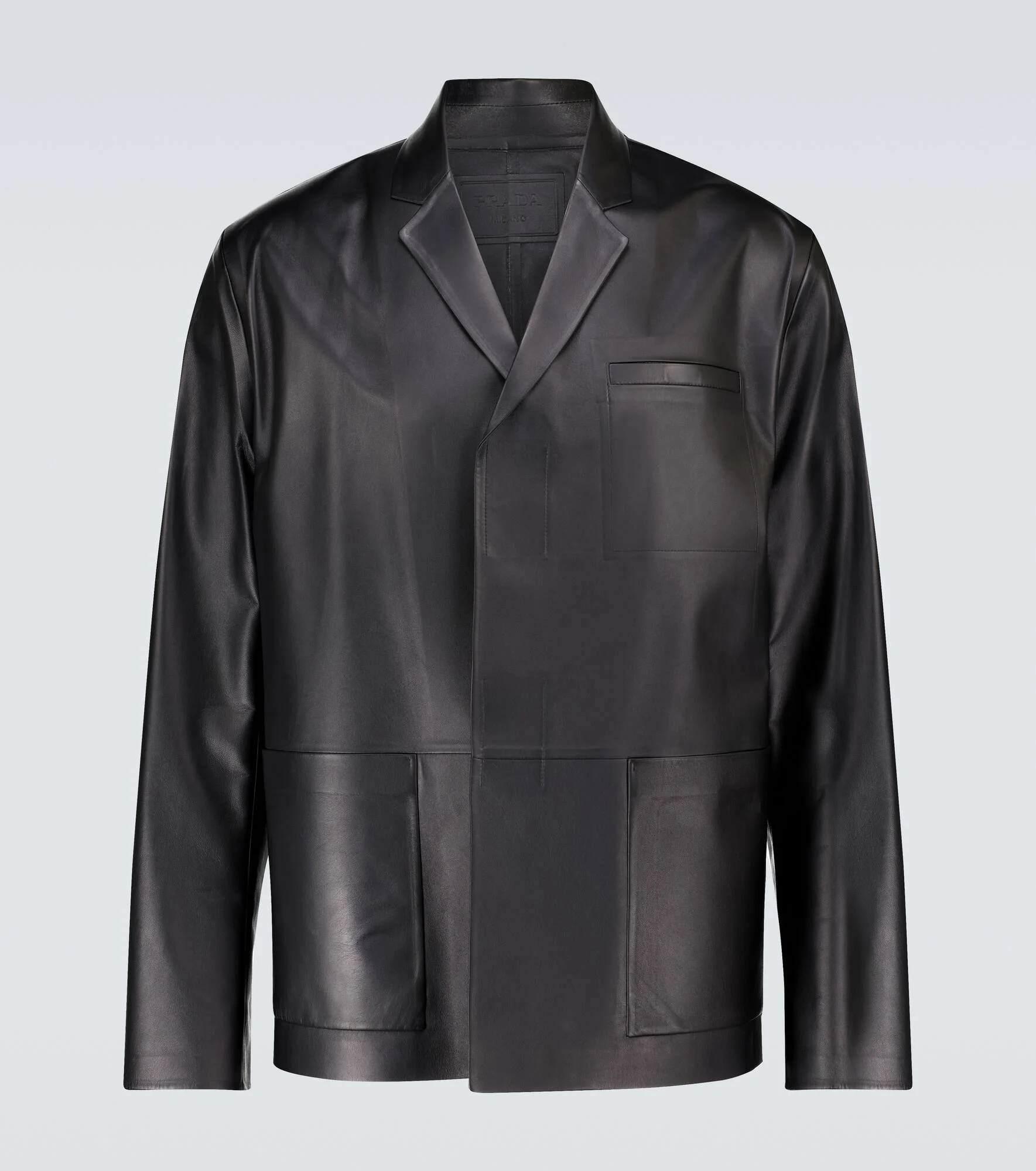 Italian-made from a bonded leather, this black Prada jacket has a single-breasted VELCRO® fastening, and a thin notched lapel. Product Details - Made in Italy - Pockets: flap pockets, breast pocket - Material: 100% lamb leather - Designer color name: Nero - Care instructions: specialist clean - Closure: VELCRO® fastening - Item number: P00521879 Size & Fit - True to size - Regular fit - Falls to the hip - The model in the picture is 185cm-6'1" and wearing a size IT 48