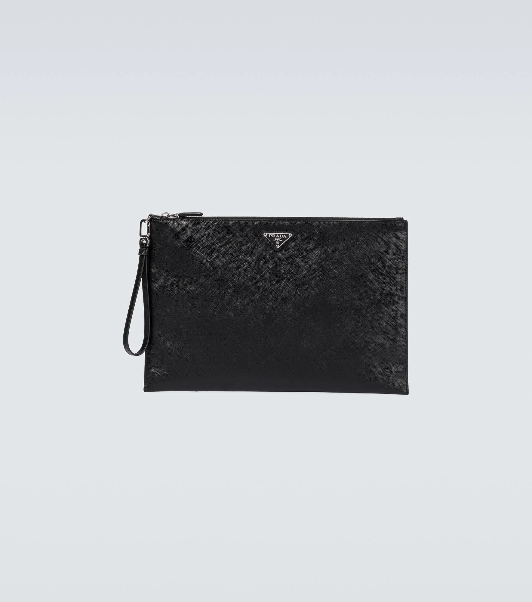 Crafted in Italy from smooth black leather, this Prada pouch features a zipped fastening, inside pocket, with a small strap, and finished with the label's enamel triangle logo on the front. Product Details - Closure: zipped top - Top handle - Designer color name: Nero - Made in Italy - Comes with dust bag - Internal details: internal slot pockets, leather lining - Color of fastening: silver - Material: calf leather - Item number: P00521913 Size & Fit - Height 23cm-9" - Width 35,5cm-14" - Length of wrist strap 30cm-12"