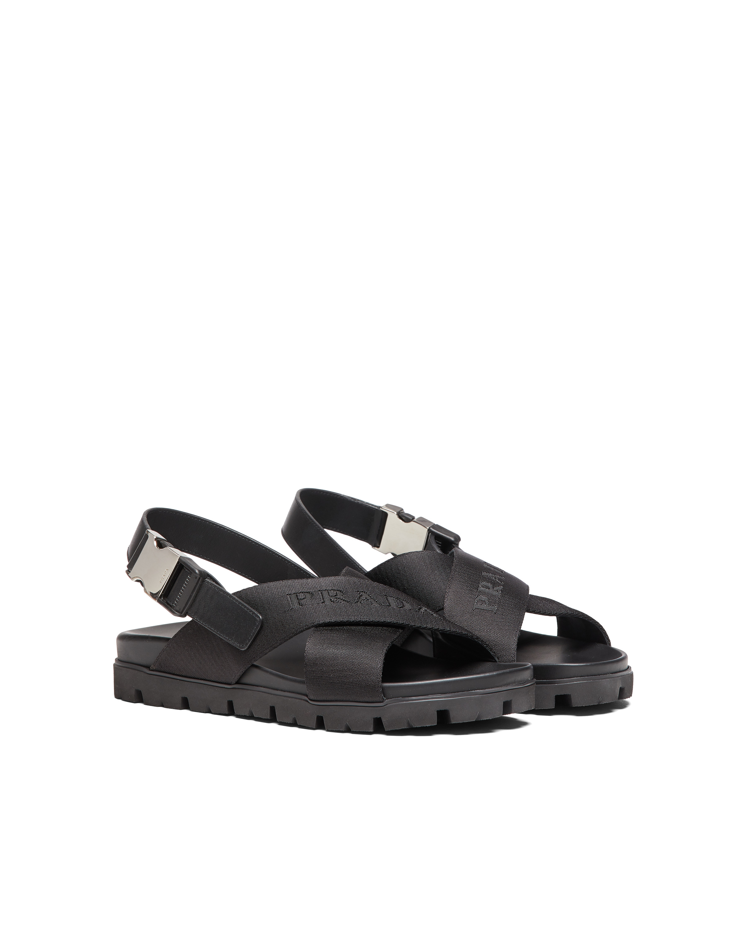 Sporty, contemporary allure characterizes these sandals with crisscross upper and screen-printed logo. Technical details enhance the original design of these sandals with lug sole. - Product code: 2X3054_3L74_F0002 - Strap with side-release buckle - Logo-print tape - Rubber sole with tire tread pattern - Leather-covered insole - Imported MATERIALS Fabric/leather
