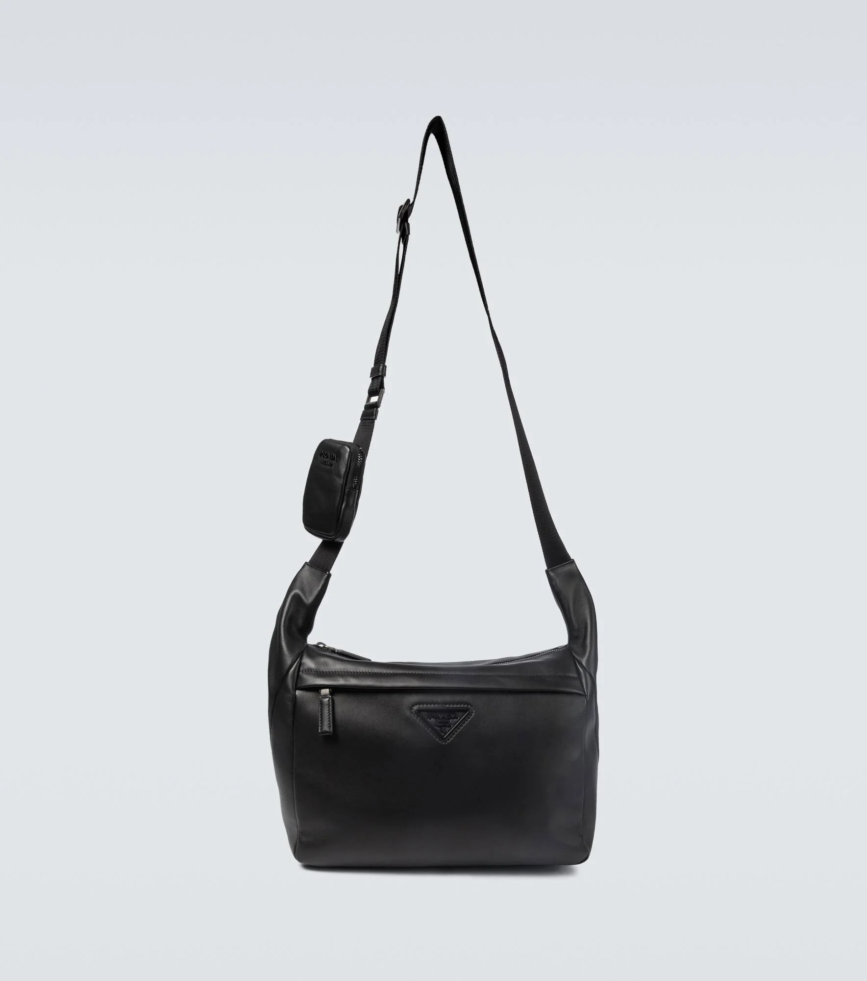 In smooth black leather, this shoulder bag from Prada comes with a versatile detachable pouch, an adjustable strap, and is enhanced with tonal lettering and the label's famous triangle logo at the front. Product Details - Internal details: internal zipped and slot pockets, fabric lining - Zipped front pocket - Designer color name: Nero - Made in Italy - Comes with dust bag - Color of fastening: anthracite - Adjustable shoulder strap - Detachable zipped pouch - Material: calf leather - Item number: P00521902 Size & Fit - Height 24cm-9.5" - Width 32cm-12.5" - Depth 10cm-4" - Pendant length 10cm-4" - Pendant width 7cm-3" - Min. length shoulder strap 70cm-27.5" - Max. length shoulder strap 107cm-42"