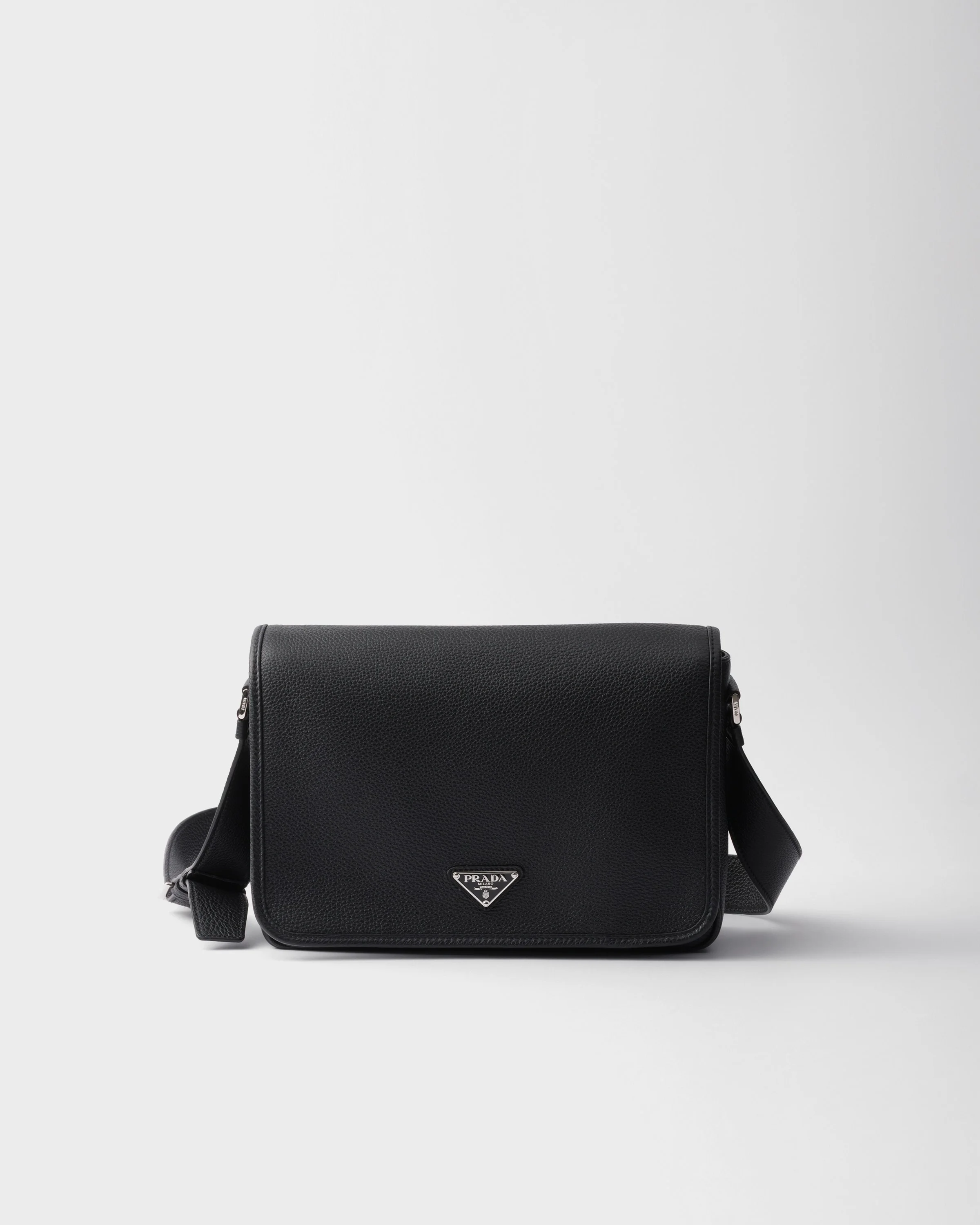This refined and versatile shoulder bag with a sleek design is made of soft leather with a natural, tactile finish. Sleek details emphasize the simple silhouette enhanced with the iconic triangle logo. - Product code: 2VD075_2BBE_F0002_V_OOO - Adjustable leather shoulder strap with buckle. Maximum length 126 cm - Minimum length: 114 cm - Maximum drop 58 cm - Minimum drop 52 cm - Enameled metal triangle logo on the flap - Flap closure with magnet - One external zipper pocket - Back zipper pocket - Interior with zipper pocket and patch pocket - Re-Nylon lining - Imported Height: 20cm Width: 30cm Length: 9cm MATERIALS Main material: Calfskin