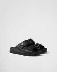 These leather slides with sporty details are defined by clean, contemporary lines. The footwear with hook-and-loop straps is completed with rubber lug soles, which give it a casual style. The enameled metal triangle logo completes the style with its sleek and iconic signature touch. - Product code: 2X3129_3LEM_F0002_F_G000 - Strap with hook-and-loop closure - Enameled metal triangle logo - Rubber lug sole - Heel height: 25 mm - Leather-covered insole - Imported MATERIALS Main material: Calfskin
