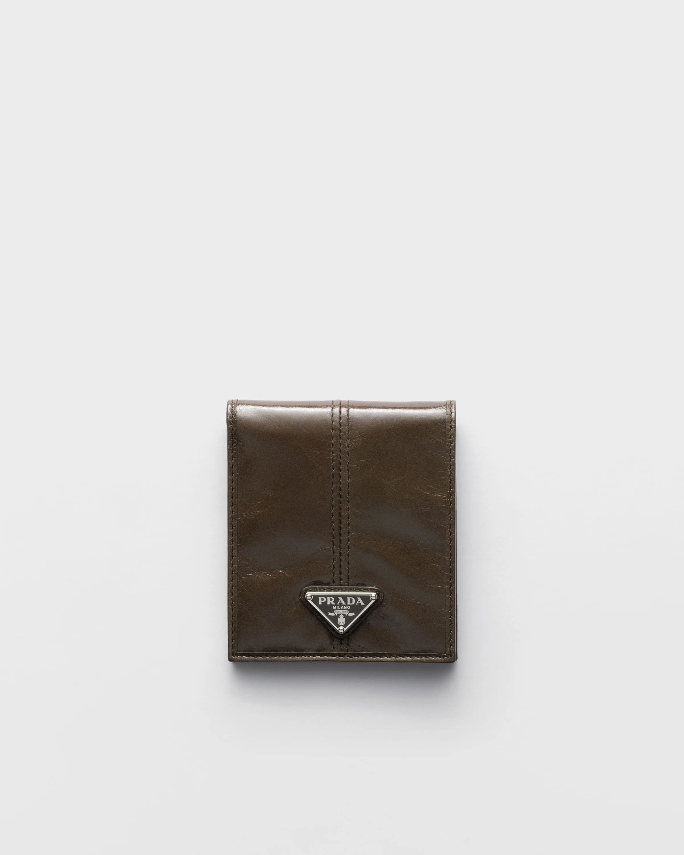 Sleek lines and iconic geometric shapes define this wallet with a classic design made of elegant shiny leather with a modern, sophisticated character. - Product code: 2MO513_2CX7_F0161 - Enameled metal triangle logo - Eight card slots - Two bill compartments - Moire and leather lining - Imported Height: 9.5cm Width: 11cm MATERIALS Main material: Calfskin
