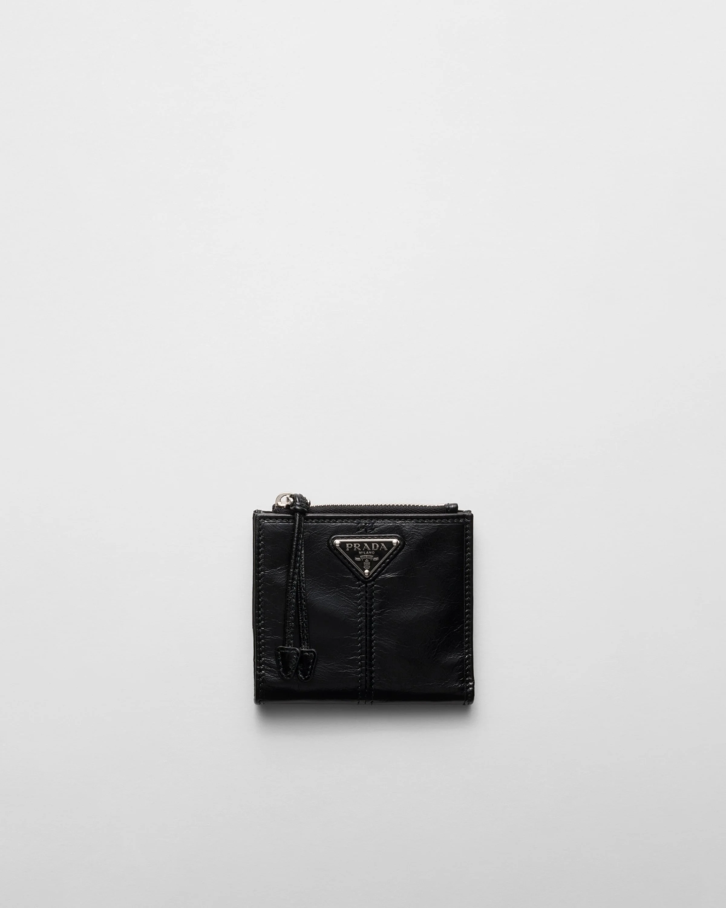 This wallet with a compact yet functional design is made of shiny leather that gives the accessory a modern, refined look. - Product code: 2ML049_2CX7_F0002 - Snap closure - Enameled metal triangle logo - Four card slots - One bill compartment - Two internal pockets - External zipper coin pocket - Moire and leather lining - Imported Height: 9cm Width: 10cm MATERIALS Main material: Calfskin