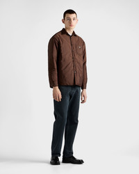 Prada's unconventional language redefines shapes and materials and transforms this classic shirt into a sophisticated, minimalist design. The garment made of light Re-Nylon is enriched with creasing that completes it with a distinctive note. For sustainable care to preserve the product's characteristics and reduce microfiber shedding, we recommend not washing the item too often. Let the product air out after every use and have it dry cleaned at a specialized ecological dry cleaners. - Product code: SC823M_1WQ9_F0324_S_OOO - Straight fit - Classic collar - Classic breast pocket - Rounded hem - Cuffs with horn button - Horn button closure - Lined and padded garment - Enameled metal triangle logo - The fabric is made of regenerated yarn obtained from plastic materials recovered in the ocean - The creases are an intrinsic characteristic because the finished garment is pressed. - Imported - The model is 191 cm tall and wears a size 48 Height: 76cm MATERIALS Main material: 100% recycled polyamide