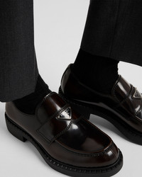 The classic masculine loafer is redesigned with new volumes and sophisticated details. Made of brushed leather, an iconic material of the brand, the shoe is decorated with the triangle logo, stitched edges and a special pattern on the rubber sole. - Product code: 2DE127_055_F0038 - Elastic gusset on the instep - Leather band - Enameled triangle logo on the vamp - Light rubber lug sole with para-style half-sole - 35 mm heel - Leather insole - Imported MATERIALS Main material: Calfskin