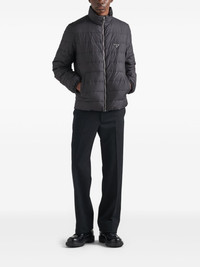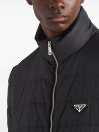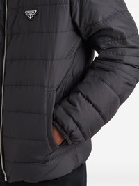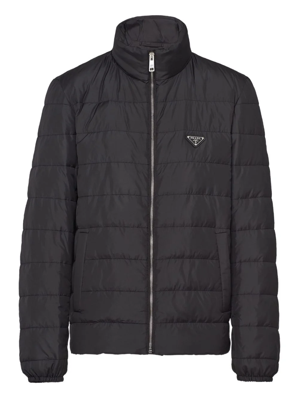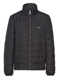 logo down jacket Boasting a padded design, this black puffer jacket is adorned with Prada's triangle logo emblem at the left chest for a branded finish. Highlights - Black - Front zip fastening - High neck - Two side slit pockets - Elasticated cuffs Composition Polyester 100% SIZE & FIT FittingInformation Designed for a relaxed fit, this piece allows for comfort and movement when worn The internal drawstring at the hem allows for fitted preferences Made from a padded non-stretch fabric, giving it no natural elasticity