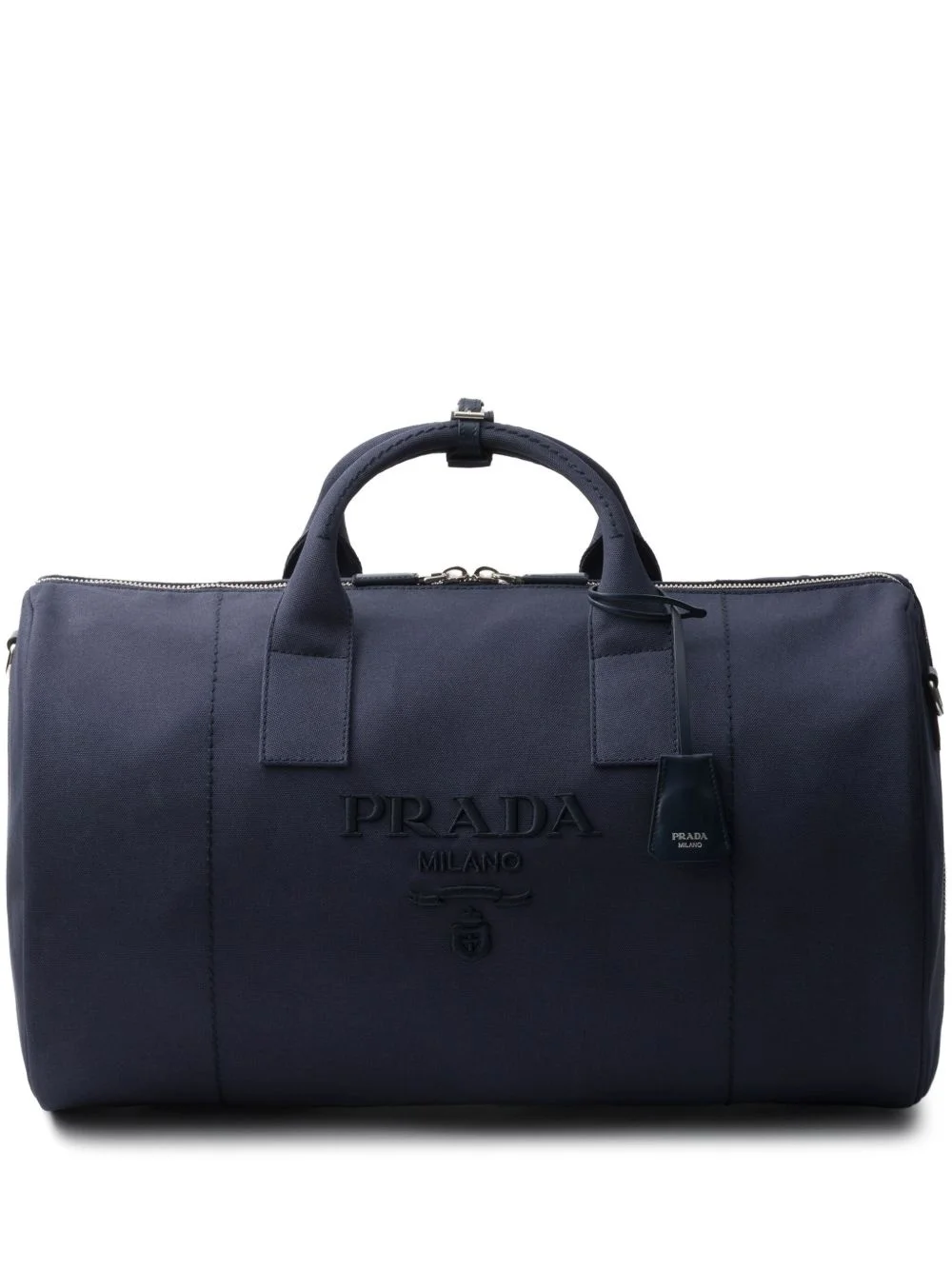 logo-embossed duffle bag Highlights - Navy blue - Embossed logo detailing - Dual top handles - Detachable shoulder strap - Main zip compartment - Luggage tag Composition Outer: Canvas 100%, Calf Leather 100%