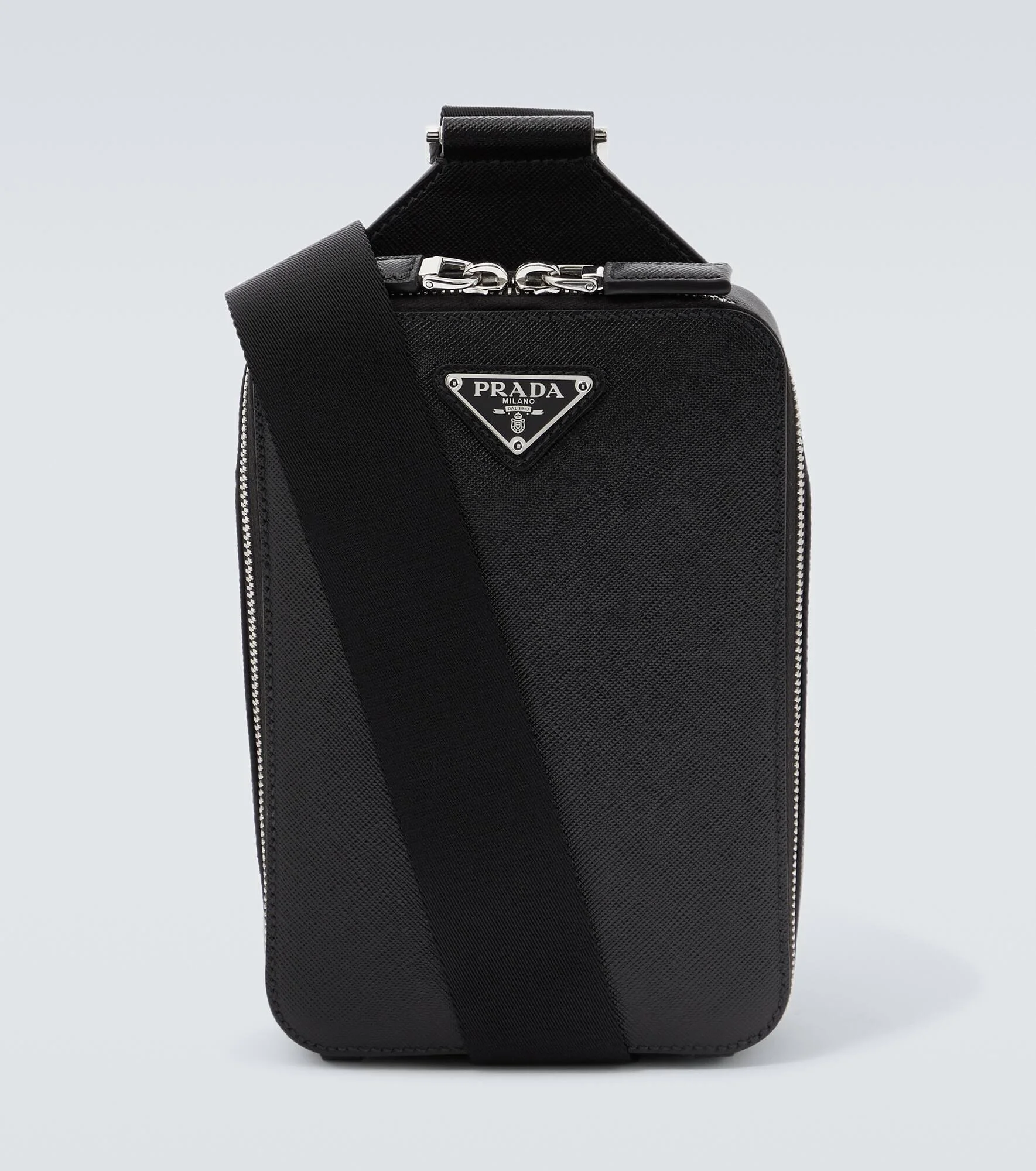 Prada's triangle logo pays tribute to the brand's long-standing connection to the Italian royal family, the House of Savoy. Made of black Saffiano leather, this bag has a messenger-style silhouette with enameled branding. Product Details - Material: leather - Made in Italy - Designer color name: Nero - Internal details: leather lining, internal slot pocket - Closure: zipped top - Detachable, adjustable shoulder strap - Comes with dust bag - Item number: P00817288 Size & Fit - Height 20cm-8" - Width 14cm-5.5" - Adjustable shoulder strap - Min. length shoulder strap 80cm-31.5" - Max. length shoulder strap 134cm-53"
