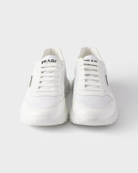 These sneakers combine an elegant yet innovative design with technical materials typical of Prada collections. This shoe is made of Re-Nylon, an innovative material produced from recycled plastic materials collected in the ocean, and brushed leather. The triangle logo, imbued with a new sporty spirit, stands out on the side, while the chunky rubber tread sole gives the silhouette hybrid allure. This product does not contribute to the SEA BEYOND educational program. - Product code: 2EE443_3LF5_F0009_F_G000 - Laces - Enamel triangle logo on the upper - Prada Milano logo screen printed on the tongue - Light rubber sole with notched welt - 45 mm sole height - Removable leather-covered insole - Imported MATERIALS Main material: Recycled polyamide