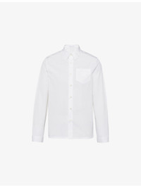 PRODUCT DETAILS - Prada cotton shirt - 100% cotton - Exposed button fastening at front - Boxy fit, classic collar, long sleeves, button cuffs, single chest patch pocket, tonal triangle logo on pocket, straight hem - Please note, we are unable to accept in-store returns on Prada orders - Model is 6ft 2in/1.88m and wears a size UK 38 - Lightweight, non-stretch Ref: R04337633