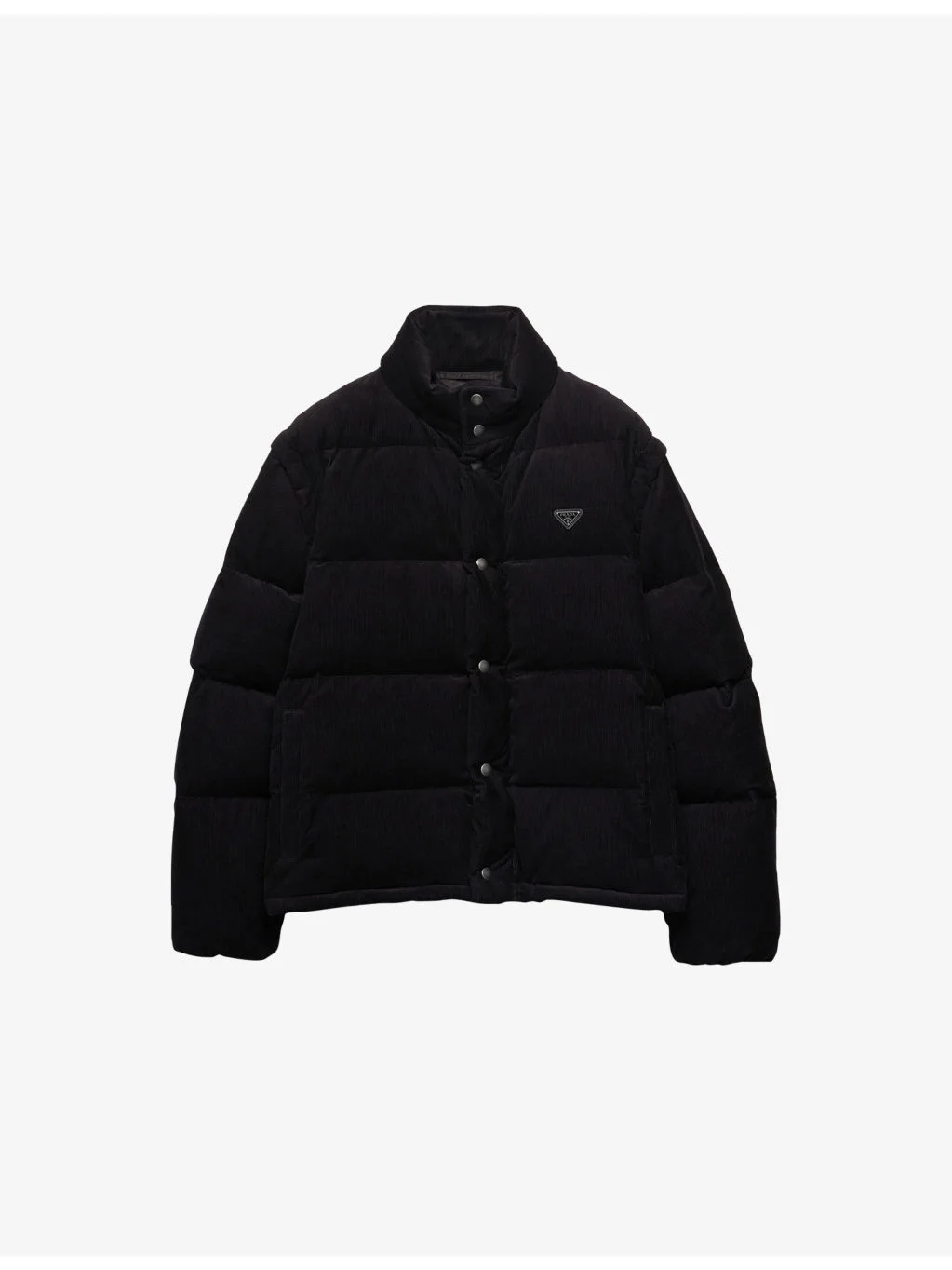 PRODUCT DETAILS - Prada down jacket - 100% cotton; padding 100% down - Exposed pressed stud and concealed zip fastening at front - Oversized fit, stand-up collar, stowaway hood, dropped shoulders, long detachable sleeves, elasticated cuffs, two side zip pockets, enameled metal triangle logo at chest, elasticated drawstring hem, lined and padded - Dry clean - Made in Italy - Midweight, non-stretch Ref: R04517682