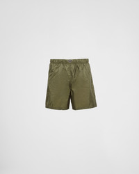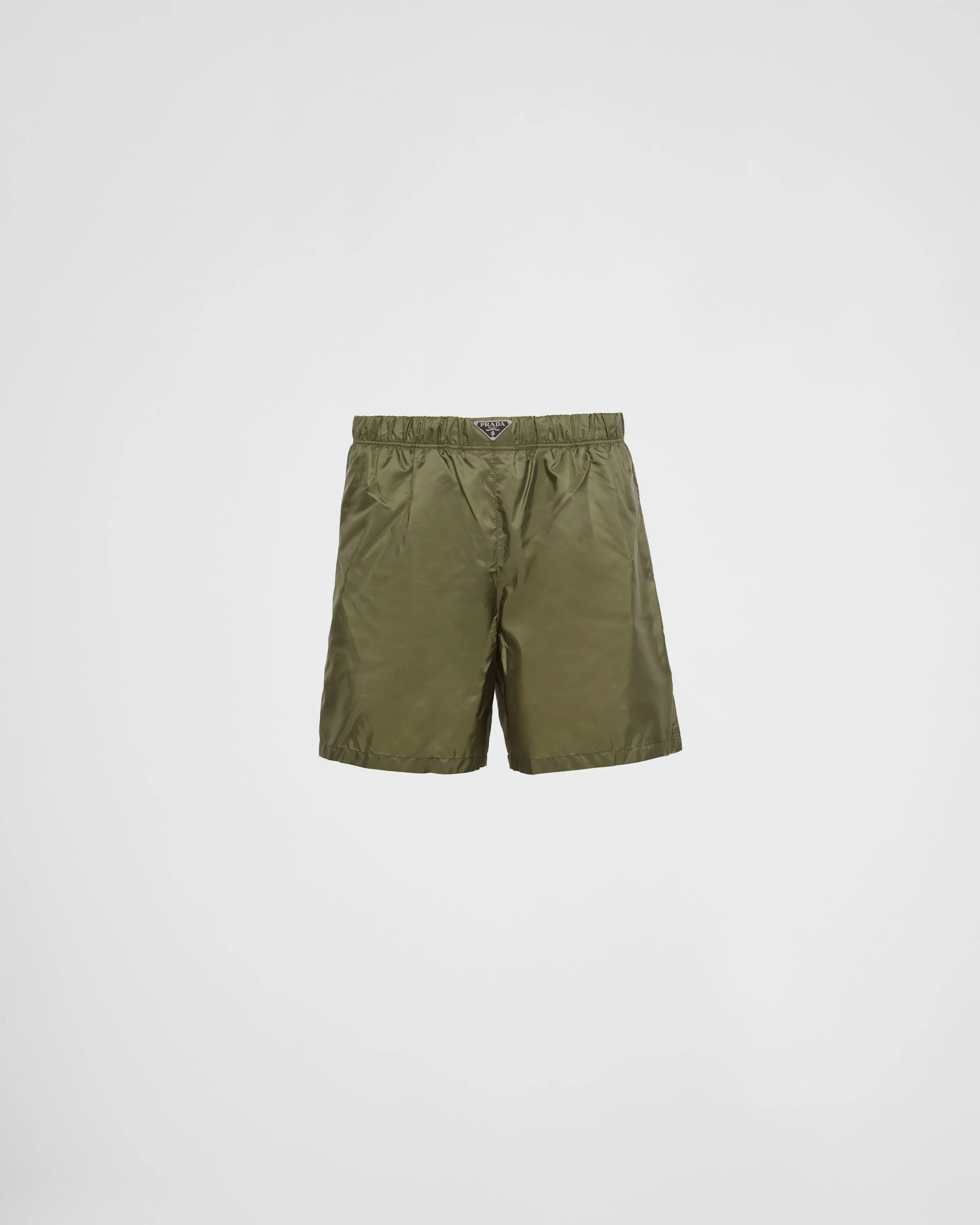 These swim trunks with a sleek, sporty design are made of Re-Nylon, the innovative regenerated nylon fabric that is distinctive of Prada collections and obtained from recycled plastic materials collected in the ocean. The style with a classic silhouette, characterized by the elasticized waistband, is decorated with the iconic enameled metal triangle logo. For sustainable care to preserve the product's characteristics and reduce microfiber shedding, we recommend not washing the item too often. Let the product air out after every use and have it dry cleaned at a specialized ecological dry cleaners. - Product code: UB372_1WQ9_F0161_S_OOO - Elasticized drawstring waistband - Enameled metal triangle logo - Mesh lining - Angled front slash pockets and back welt pocket - Re-Nylon pouch with fabric triangle - The fabric is made from regenerated yarn obtained from recycled plastic materials collected in the ocean. - Imported - The model is 189 cm tall and wears a size 48 Height: 41cm MATERIALS Main material: 100% recycled polyamide