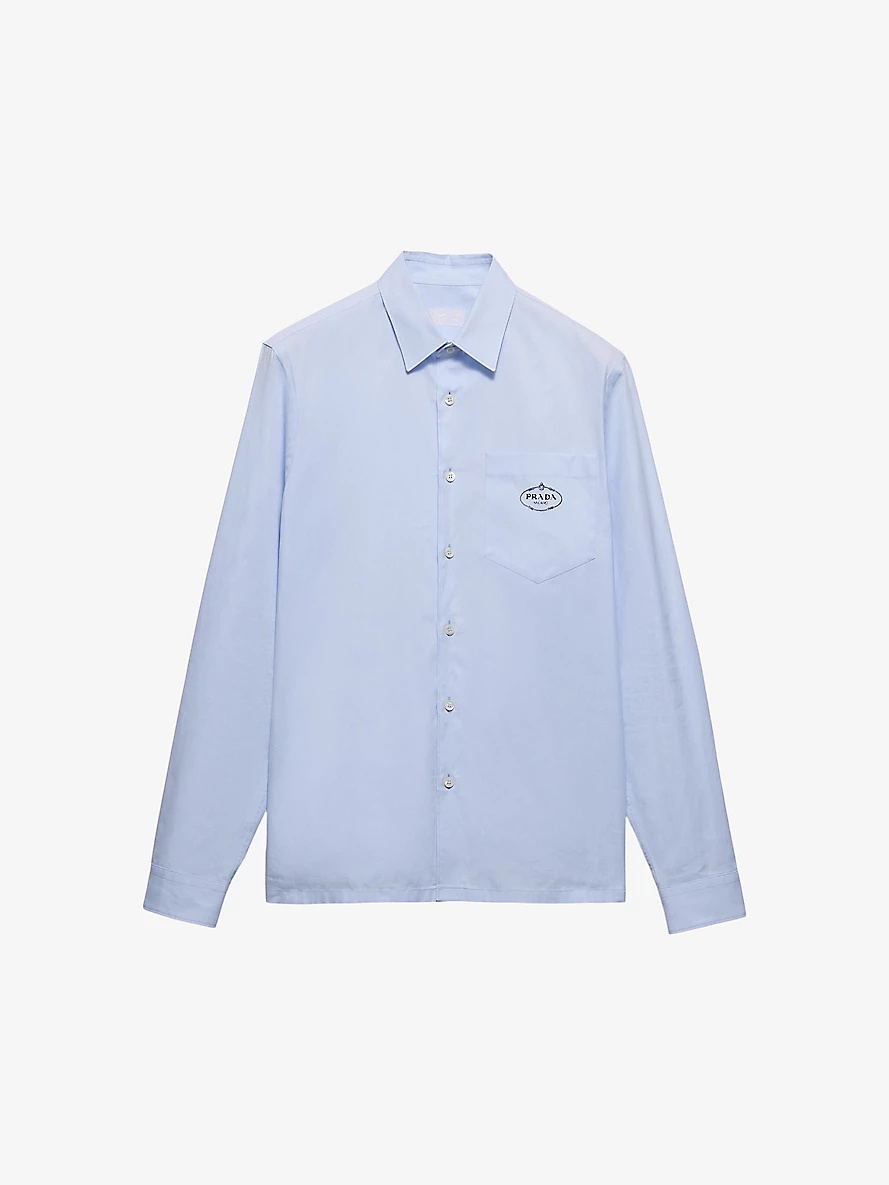 PRODUCT DETAILS - Prada cotton shirt - 100% cotton - Button fastening - Regular fit, collar, long sleeves, buttoned sleeve hems, patch pocket at chest, brand text embroidery at chest, straight hem - Machine wash cold - Model is 6ft 2in/1.88m and wears a size UK 40 - Lightweight, non-stretch Ref: R04388823