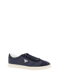 Prada's leather Sneakers feature suede details and a round toe for a sleek, modern design. The iconic triangular logoed plaque is applied to the side panel, while the brand's monogram is visible on the heel, adding a distinctive touch. The flat sole offers comfort, while the branded insole lends an additional luxury detail. A sophisticated pair of sneakers, ideal for a casual yet trendy look. DETAILS sku 2EE394FG000D7C_F0008 composition: RUBBER 100% CALF LEATHER BOS TAURUS 100% color group: BLUE gender: MAN season: SS25 size chart: SHOES UK category name: LACE UP