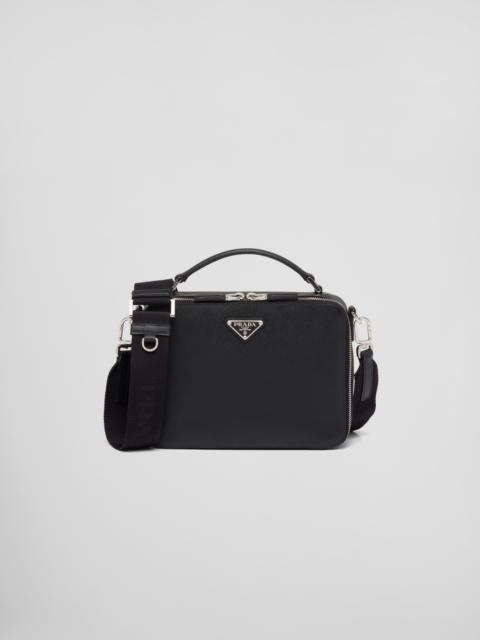 The Prada Brique bag in Saffiano leather stands out for its sleek lines. Saffiano leather, an iconic Prada material, is synonymous with luxury and identifies with traditional Italian leather goods production. - Product code: 2VH069_9Z2_F0007_V_YMI - Leather handle - Detachable adjustable woven nylon and leather shoulder strap - Enameled metal triangle logo on the front - Zipper closure - Ring on the shoulder strap for trick - Lining with patch pocket - Prada logo nylon lining - Imported Height: 16cm Width: 22cm Length: 6cm MATERIALS Main material: Calfskin