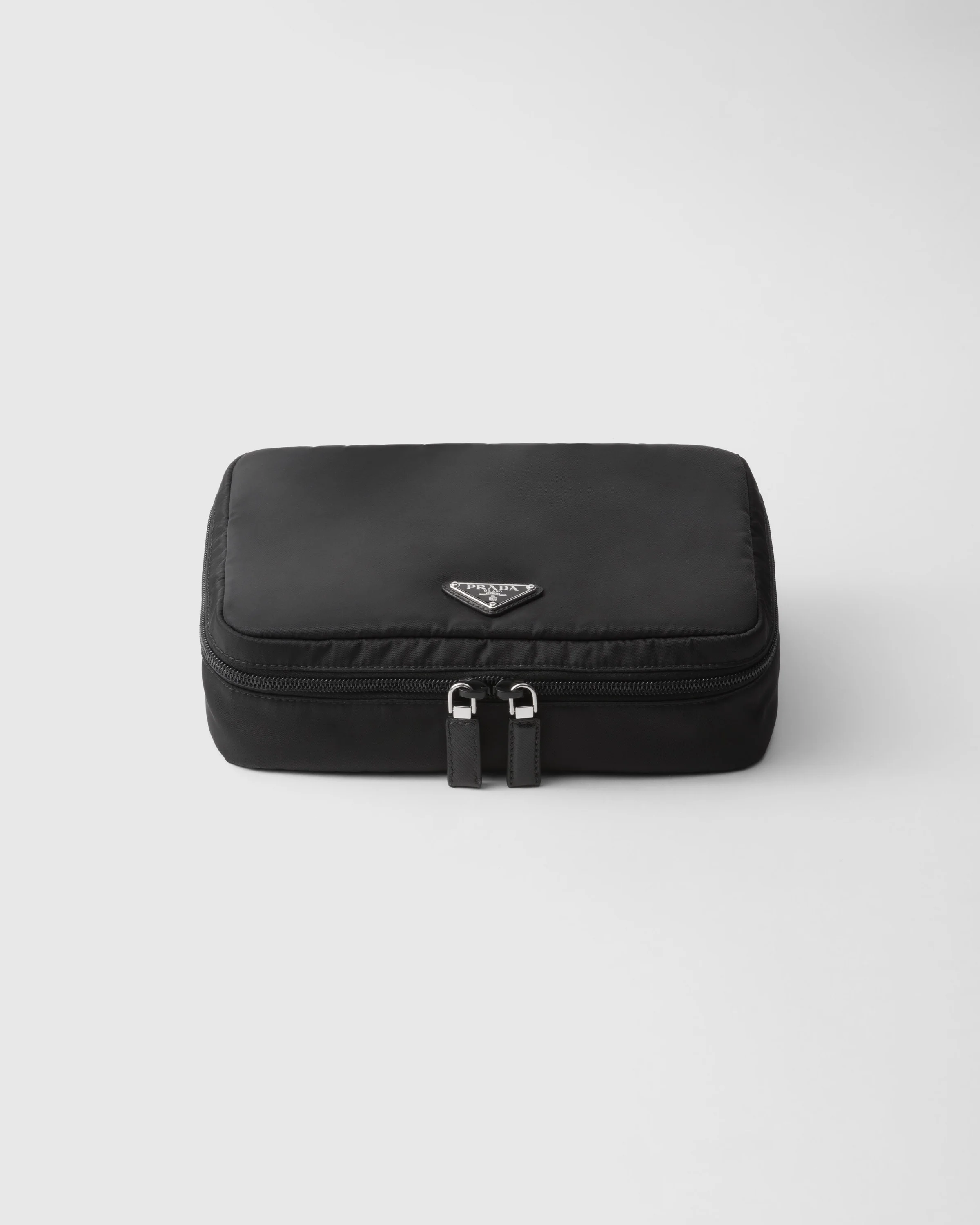 This pouch with a sleek, pragmatic design is made of Re-Nylon, the innovative regenerated nylon fabric obtained from recycled plastic materials collected in the ocean. The accessory with internal pocket and zipper closure is completed by the enameled metal triangle logo. For sustainable care to preserve the product's characteristics and reduce microfiber shedding, we recommend not washing the item too often. Let the product air out after every use and have it dry cleaned at a specialized ecological dry cleaners. - Product code: 2NA059_2DMI_F0002 - Enameled metal triangle logo on the front - Zipper closure - Interior with zipper pocket - Logo-print Re-Nylon lining - Imported Height: 8cm Width: 24cm Length: 17cm MATERIALS Main material: Recycled Polyamide