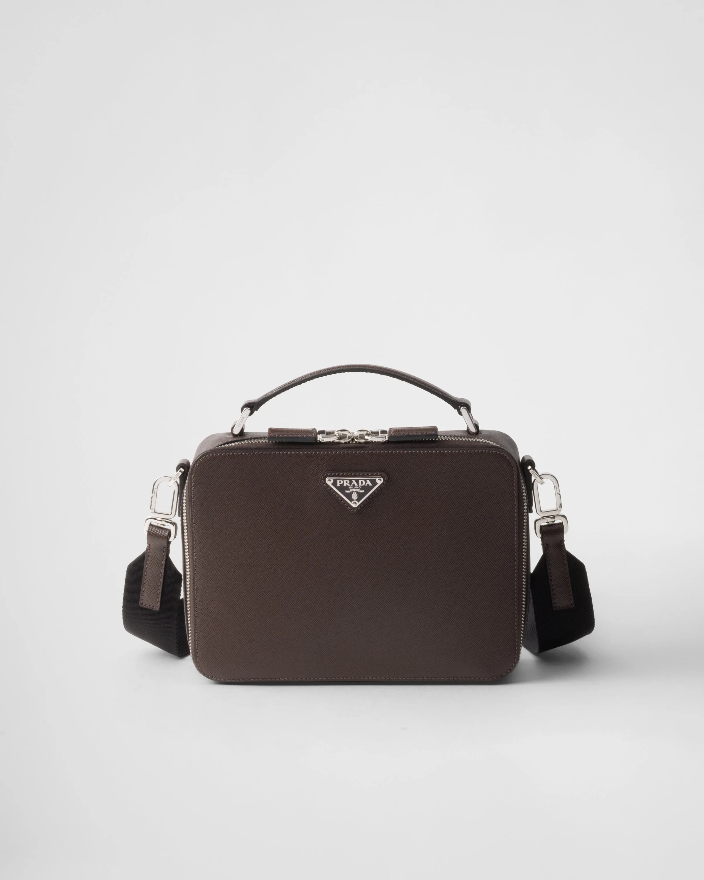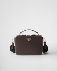 The Prada Brique bag in Saffiano leather stands out for its sleek lines. Saffiano leather, an iconic Prada material, is synonymous with luxury and identifies with traditional Italian leather goods production. - Product code: 2VH069_9Z2_F0201_V_YMI - Leather handle - Detachable adjustable woven nylon and leather shoulder strap - Enameled metal triangle logo on the front - Zipper closure - Ring on the shoulder strap for trick - Lining with patch pocket - Prada logo nylon lining - Imported Height: 16cm Width: 22cm Length: 6cm MATERIALS Main material: Calfskin