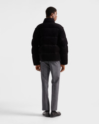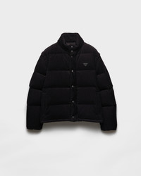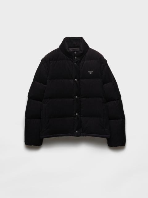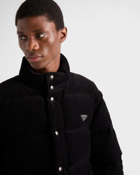 The soft texture of corduroy emphasizes the volumes of this down jacket with sporty style. Goose down padding completes the warm and versatile design decorated with the enameled metal triangle logo. - Product code: SGC946_1JHC_F0002_S_OOO - Oversized fit - Stand-up collar and stowaway hood - Detachable sleeve - Zipper and button closure - Welt zipper pockets - Elasticized cuff - Drop shoulder - Straight hem - Elasticized drawstring - Lined and padded with goose down - Enameled metal triangle logo on the front - Imported - The model is 189 cm tall and wears a size 48 Height: 70cm MATERIALS Main material: 100% Cotton