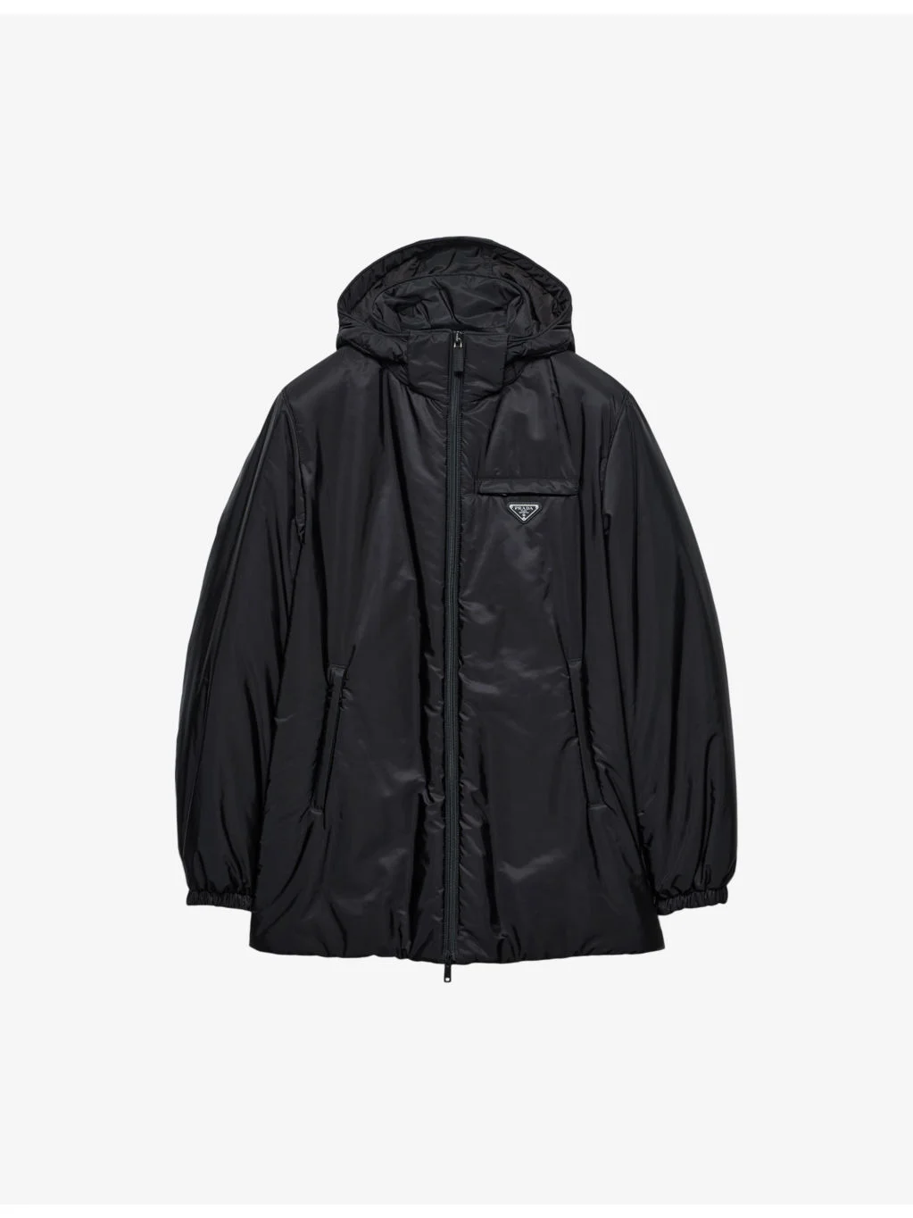 PRODUCT DETAILS - Prada Re-Nylon down jacket - 100% recycled nylon; filing 90% goose down, 10% feathers - Zip fastening - Relaxed fit, funnel neck, hood, long sleeves, pocket at chest, triangle enamelled logo at chest, angled slip pockets at front, padded, branded hardware - Dry clean - Model is 6ft 2in/1.88m and wears a size UK 40 - Midweight, non-stretch Ref: R04388815