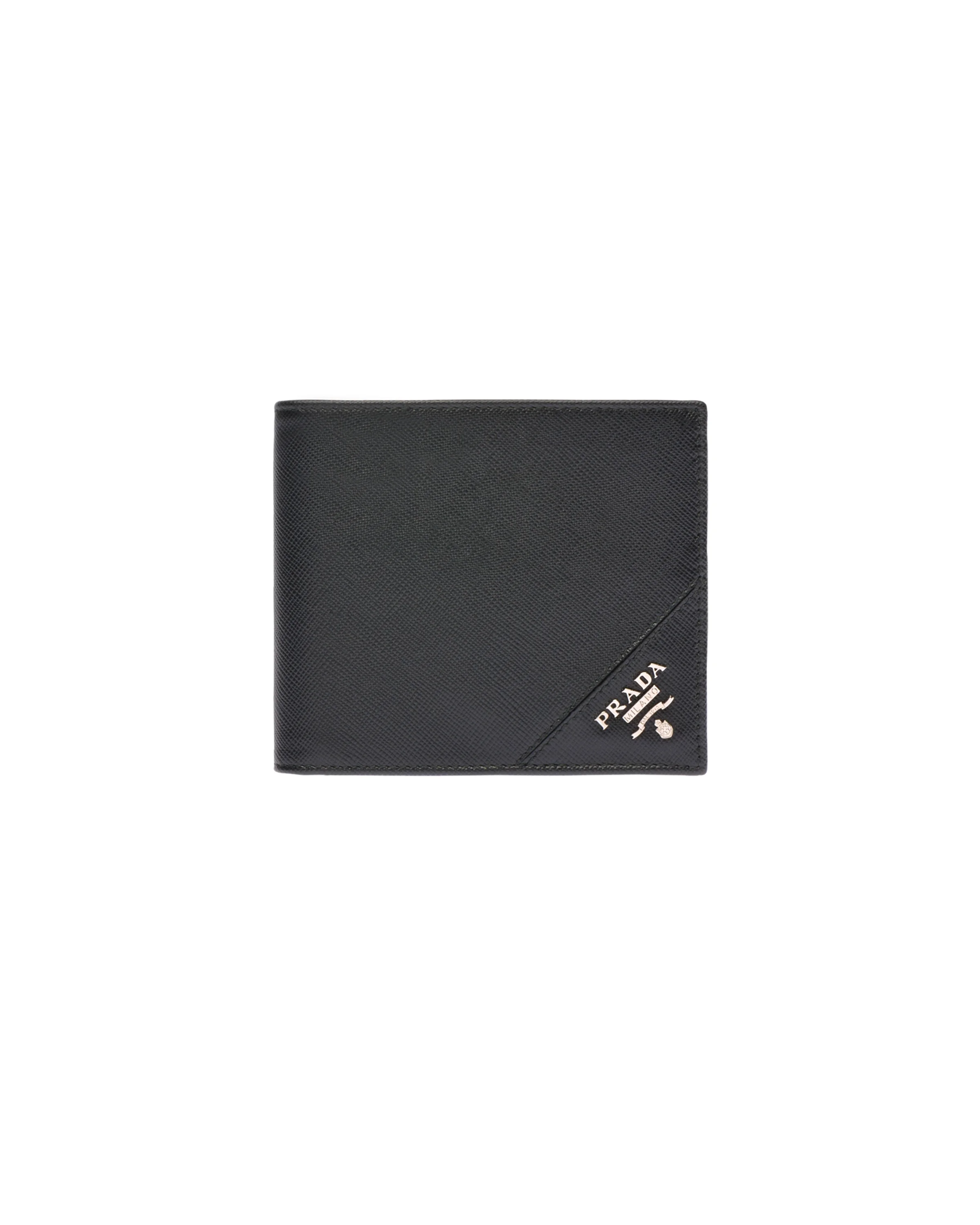This Saffiano leather wallet features a corner Prada logo on intarsia. Inside there is a coin compartment, four credit card slots and two bill compartments with fabric lining throughout. - Product code: 2MO738_QME_F0002 - Metal lettering logo - Four card slots - Two bill compartments - Internal coin pocket with flap - Moire and Saffiano leather lining - Imported Height: 9.5cm Width: 11cm MATERIALS Main material: Calfskin