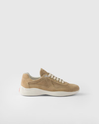 A new version of an icon. The America's Cup sneakers in suede maintain their distinctive line and lightness but have a soft, new upper. - Product code: 4E3400_Z5O_F0379_F_G000 - Enameled metal eyelets and cotton laces - Prada red label applied on the tongue - Laced style - Light expanded rubber sole - Sole height, 35 mm - Removable leather-covered insole - Imported MATERIALS Main material: Calfskin