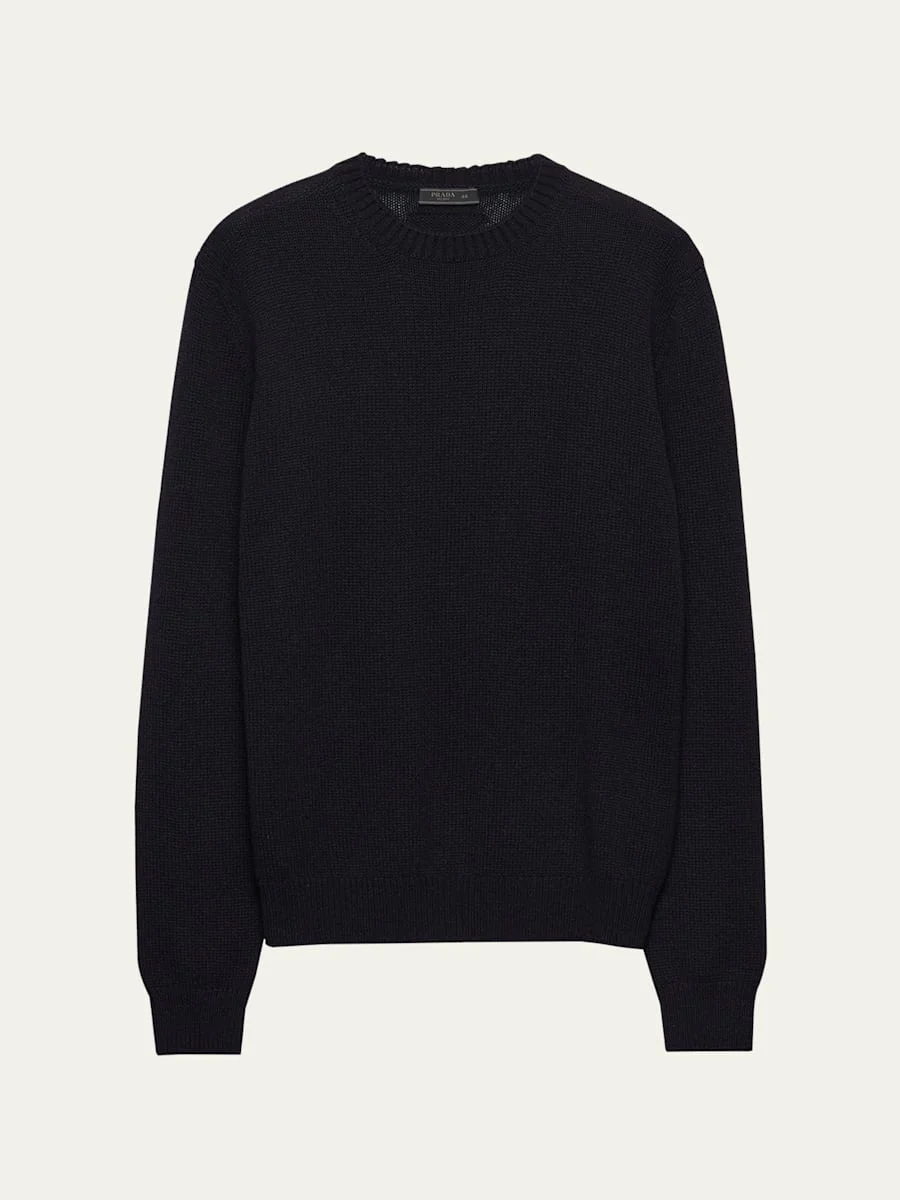 Prada solid knit sweater crafted from premium cashmere for a softer finish Crew neckline Long sleeves Ribbed cuffs and hem Pullover style Cashmere Dry clean Made in Italy Online Inquiries: BGS21_NDM8Y| Store Inquiries: #5047567