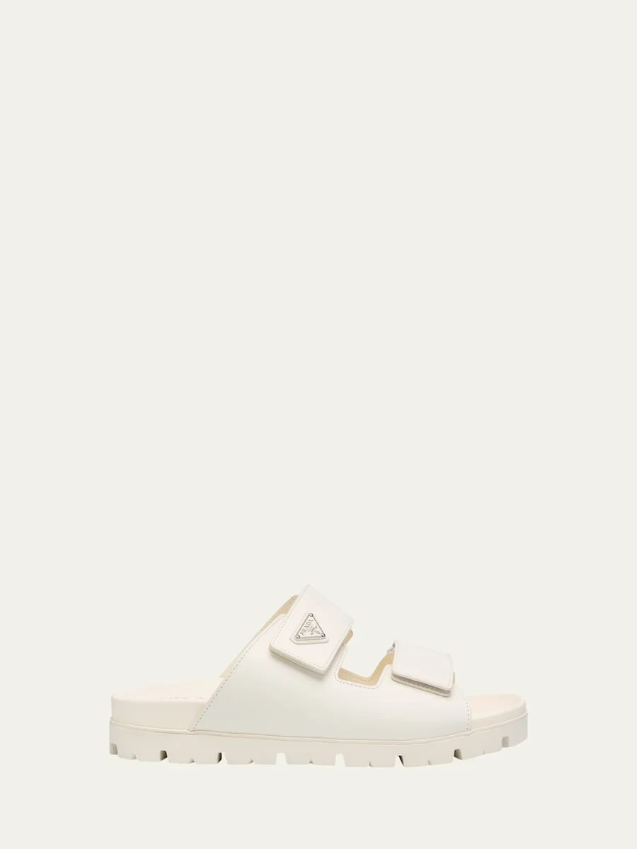 Prada smooth calf leather comfort sandals with signature logo triangle Chunky flat heel Open toe Double grip strap upper Slide style Molded comfort footbed Rubber outsole Professional cleaning recommended, spot clean Made in Italy Online Inquiries: BGS21_NBNU0| Store Inquiries: #4681607