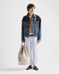 This linen blend drawstring duffel bag with a light, sporty design is characterized by the adjustable shoulder strap and enriched with leather trim. The embroidered tonal lettering logo gives the accessory distinctive, timeless style. - Product code: 2VY011_2CX9_F0018_V_OOO - Linen blend handle - Detachable, adjustable woven cotton tape shoulder strap. Maximum length 100 cm - Minimum length: 55 cm - Embroidered lettering logo on the front - Drawstring closure - Detachable leather key ring with lettering logo - Interior with zipper pocket - Canvas lining - Imported Height: 55cm Width: 34cm Length: 34cm MATERIALS Main material: Cotton linen
