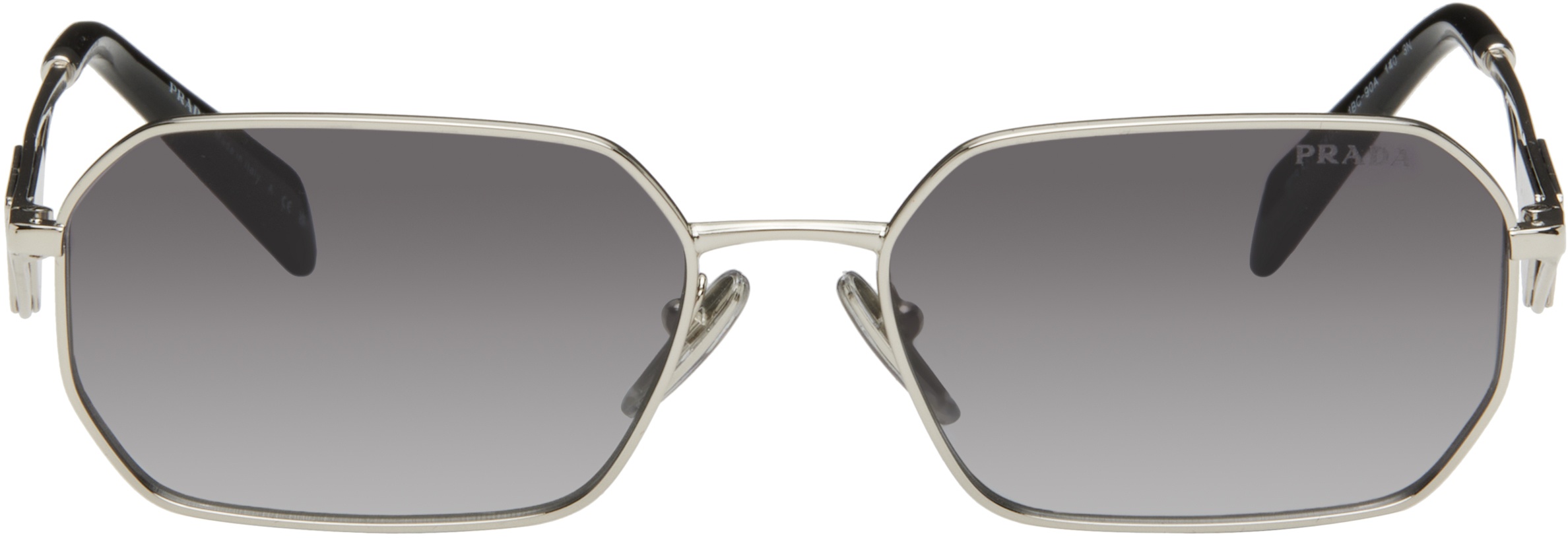 Rectangular metal-frame sunglasses in silver tone. - Gradient gray lenses - 100% UVA/UVB protection - Logo etched at lens - Adjustable rubber nose pads - Enameled logo plaque with cutouts at temples - Black acetate temple tips - Includes saffiano leather case - Size: 58.17 140 Supplier color: Silver