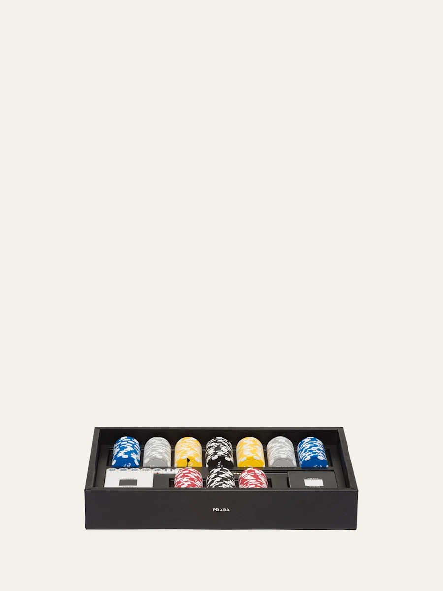 Prada complete poker set features a luxurious Saffiano leather case Metal logo lettering at front Poker dice set Chip set Two branded pencils Two decks of cards Approx. 3.35"H x 13.39"W x 9.9"L Made in Italy