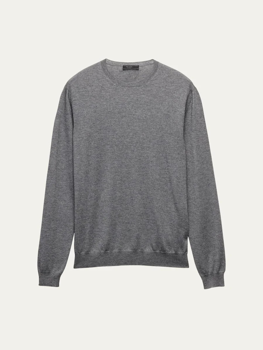 Prada sweater made with a blend of fine cashmere and silk yarn Crew neckline Fabric triangle logo on back neck Long sleeves Pullover style Silk/cashmere Dry clean Made in Italy Online Inquiries: BGS21_ND2QX| Store Inquiries: #5006952