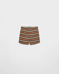 These technical fabric swim trunks are characterized by their sleek design completed with sporty yet refined details. A stripe motif with vintage charm enhances the style. For sustainable care to preserve the product's characteristics and reduce microfiber shedding, we recommend not washing the item too often. Let the product air out after every use and have it dry cleaned at a specialized ecological dry cleaners. - Product code: UB378_17N7_F0005_S_OOO - "Stripes" print - Straight fit - Elasticized waistband with drawstring - Mesh lining - Front welt pockets and back patch pockets - Re-Nylon pouch with triangle logo and sartorial logo label - Imported - The model is 189 cm tall and wears a size 48 Height: 38cm MATERIALS Main material: 70% polyamide 30% recycled polyamide