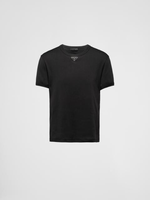 This short-sleeved cotton tee has a skinny fit and a ribbed knit crew neck. The garment is decorated with the iconic enameled metal triangle logo on the front. - Product code: UJN824_11ZM_F0009_S_222 - Extra-slim fit - Short sleeves - Ribbed knit sleeve trim - Enameled metal triangle logo - Length 68 cm, Size: M - Imported - The model is 189 cm tall and wears a size 48 Height: 68cm MATERIALS Main material: 100% cotton