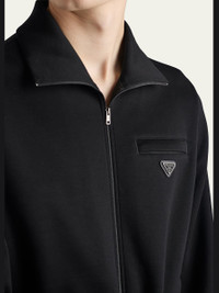 Prada jacket in technical cotton defined by a leather-trimmed signature triangle logo on the chest Stand collar Full-zip front Chest pocket Side zip pockets Long sleeves Ribbed cuffs and hem Cotton Dry clean Made in Italy Online Inquiries: BGS21_NDM8X| Store Inquiries: #5047566