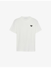 PRODUCT DETAILS - Prada cotton-blend t-shirt - 82% cotton 18% polyamide - Boxy relaxed-fit, crewneck, short sleeves, triangle logo patch at chest, straight hem - Made in Italy - Model is 6ft 2in/1.88m and wears a size medium - Lightweight, stretchy - Please note, we are unable to accept in-store returns on Prada orders Ref: R04471395