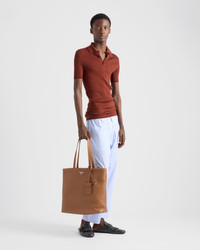 This leather tote with a sleek silhouette has a versatile, roomy design. It features refined details and is decorated with the distinctive enameled metal triangle logo. - Product code: 2VG130_2BBE_F0046_V_OOO - Leather handles - Enameled metal triangle logo on the front - Removable leather name tag and key ring - Interior with zipper pocket - Logo-print Re-Nylon lining - Imported Height: 37cm Width: 38cm Length: 12cm MATERIALS Main material: Calfskin