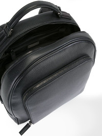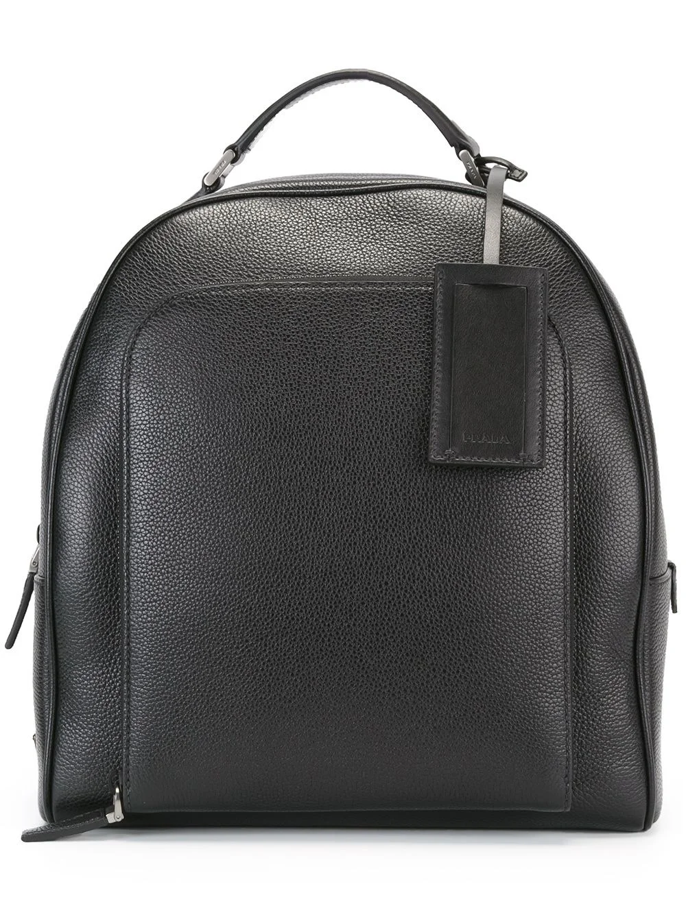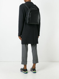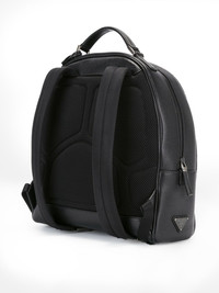 minimal style backpack Black calfskin minimal style backpack from Prada featuring internal zipped pockets, a front zip pocket, a round top handle, a hanging leather tag and an embossed logo. Composition Calf Leather 100% SIZE & FIT Model measurements Height 6 ft 2 in(1.89 m) Bust/Chest 36.22 in(92 cm) Hips 35.82 in(91 cm) Waist 28.74 in(73 cm) Measurement WIDTH 11.81 in(30 cm) HEIGHT 12.2 in(31 cm) HANDLE 2.75 in(7 cm) DEPTH 5.11 in(13 cm) STRAP 22.44 in(57 cm)