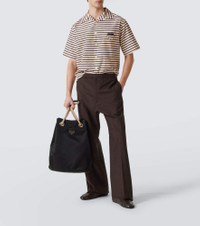 You can count on Prada for impeccably constructed pieces like these mohair and silk wide-leg pants. Made in Italy, they have a zipper fly closure and adjustable buckle straps along the waistband. Product Details - Material: 80% mohair, 20% silk - Care instructions: dry clean - Made in Italy - Designer color name: Ebano - Item color: brown - Item number: P01060637