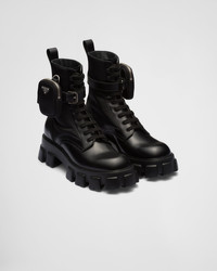 These brushed leather and nylon boots are decorated with a versatile pouch that recalls a multi-pocket design. The formal rigor of the uniform inspires this shoe, an expression of a timeless design, monolithic and unique, that reinterprets the dual soul of Prada from a modernist perspective. The maxi sole that defines the bold lines of Monolith footwear is combined with elegant brushed leather, emphasizing the brand's desire to create harmony through diametrically opposed hybrid concepts. This product does not contribute to the SEA BEYOND educational program. - Product code: 2UE007_3LFR_F0002_F_D002 - Upper: brushed leather and nylon - Metal eyelets and laces - Removable nylon pouch - Enameled metal triangle logo - Light rubber lug tread sole - Sole height: 60 mm - Imported MATERIALS Main material: Calfskin