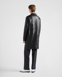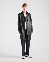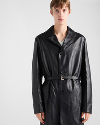 Clean lines and sleek details define this nappa leather coat with a contemporary design that blends minimalism and fine craftsmanship. The straight-cut style is completed by a narrow belt and the tonal triangle logo. - Product code: UPS655_FLY_F0002_S_OOO - Lined - Regular fit - Center button closure - Classic lapel - Straight sleeve - Wide welt pockets - Leather triangle logo on the center back - With belt - Pressed finished garment - Imported Height: 100cm MATERIALS Main material: Lambskin