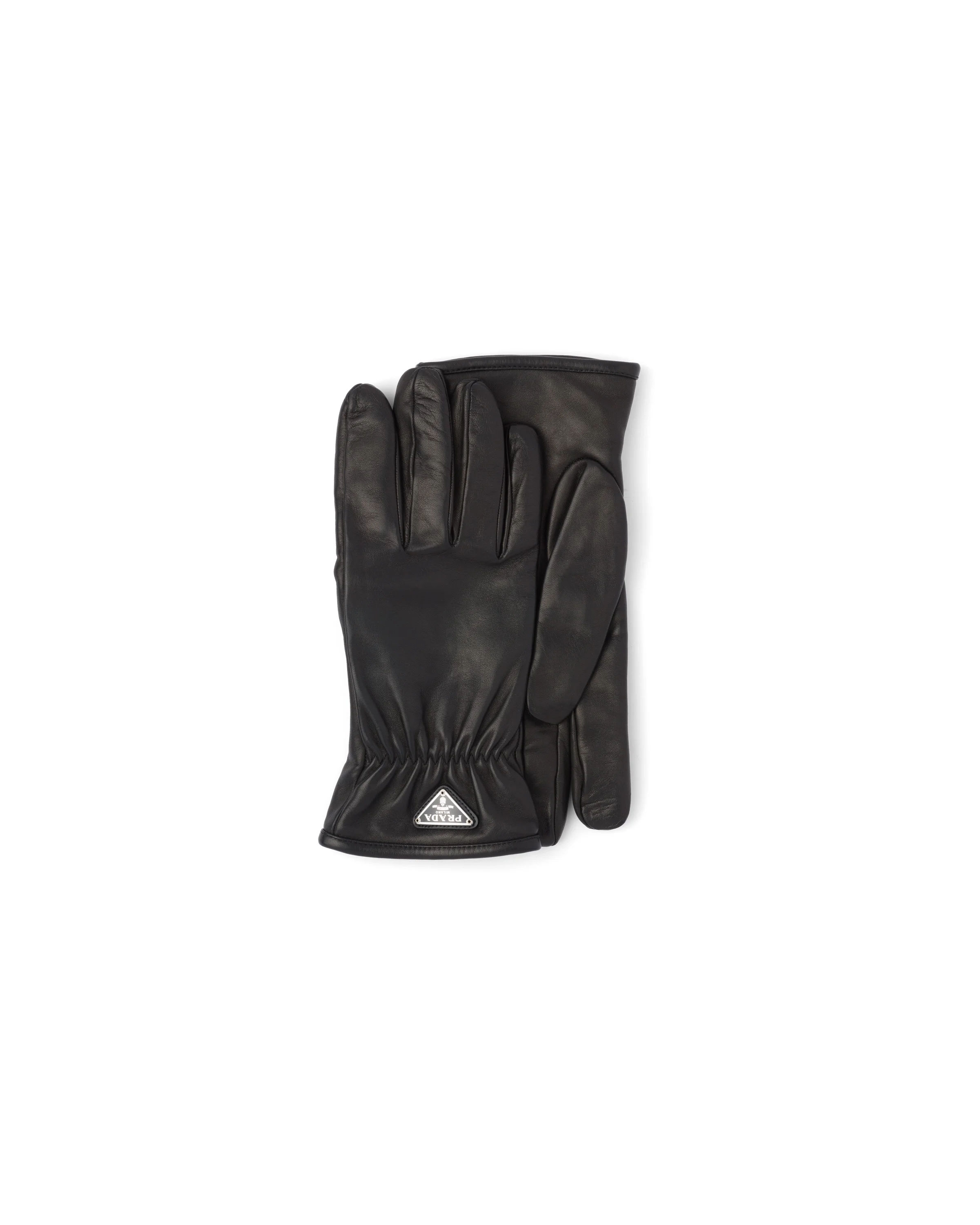 These nappa leather gloves feature a soft, elegant design embellished with the iconic enameled metal triangle logo. - Product code: 2GG125_038_F0002 - Enameled metal triangle logo - Cashmere lining - Imported MATERIALS Main material: Recycled polyester