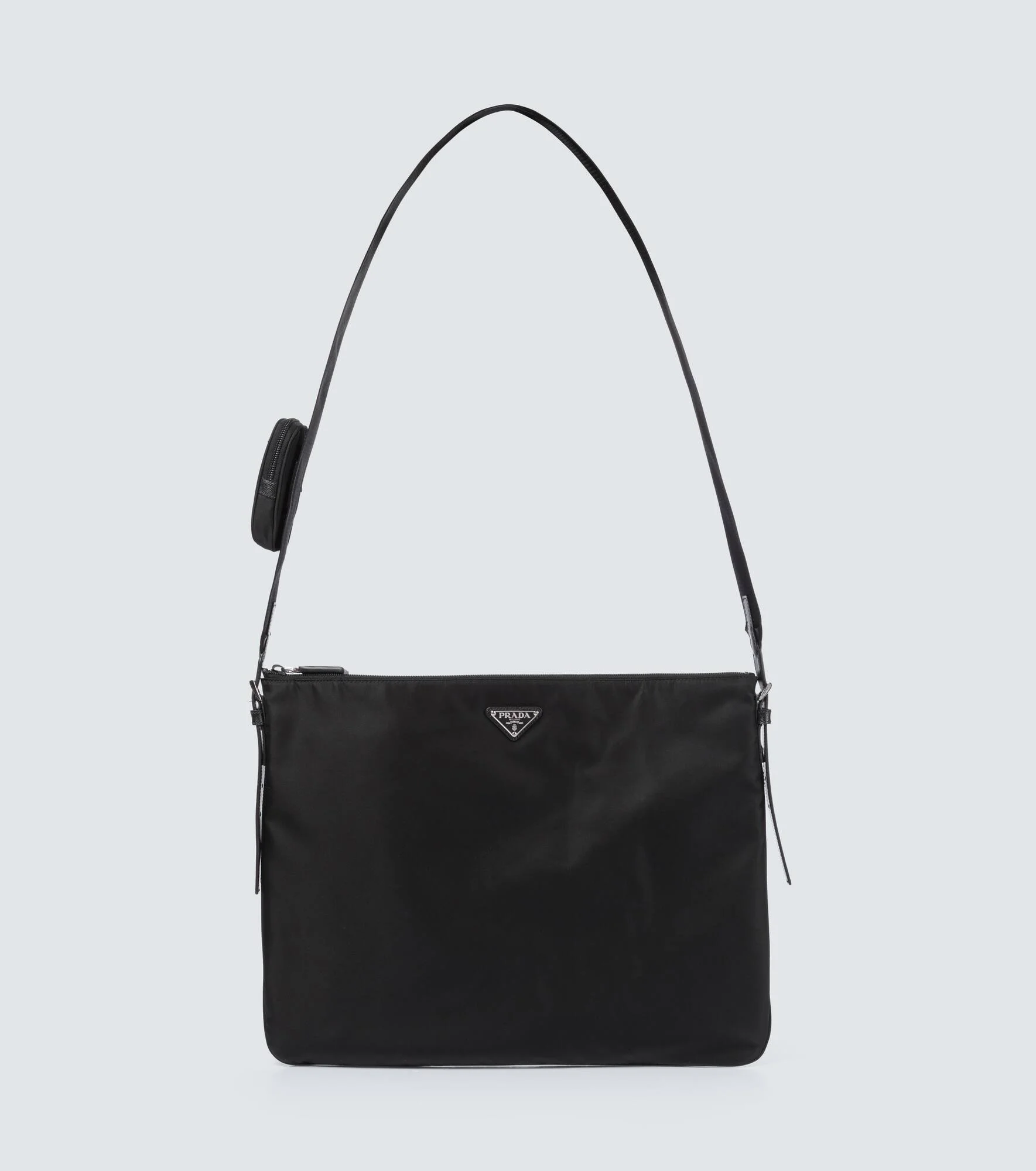 Made from a technical fabric, this Prada bag comes in black sporting a leather trim, adjustable strap, zipped closure, and triangle enamel logo on the front. Product Details - Trim: calf leather - Designer color name: Nero - Closure: zipped top - Detachable zipped pouch - Material: fabric - Detachable, adjustable shoulder strap - Internal details: fabric lining, internal zipped pocket - Color of fastening: silver - Item number: P00521904 Size & Fit - Height 35cm-14" - Width 45cm-17.5" - Min. length shoulder strap 112cm-44" - Max. length shoulder strap 152cm-60" - Strap width 5cm-2"