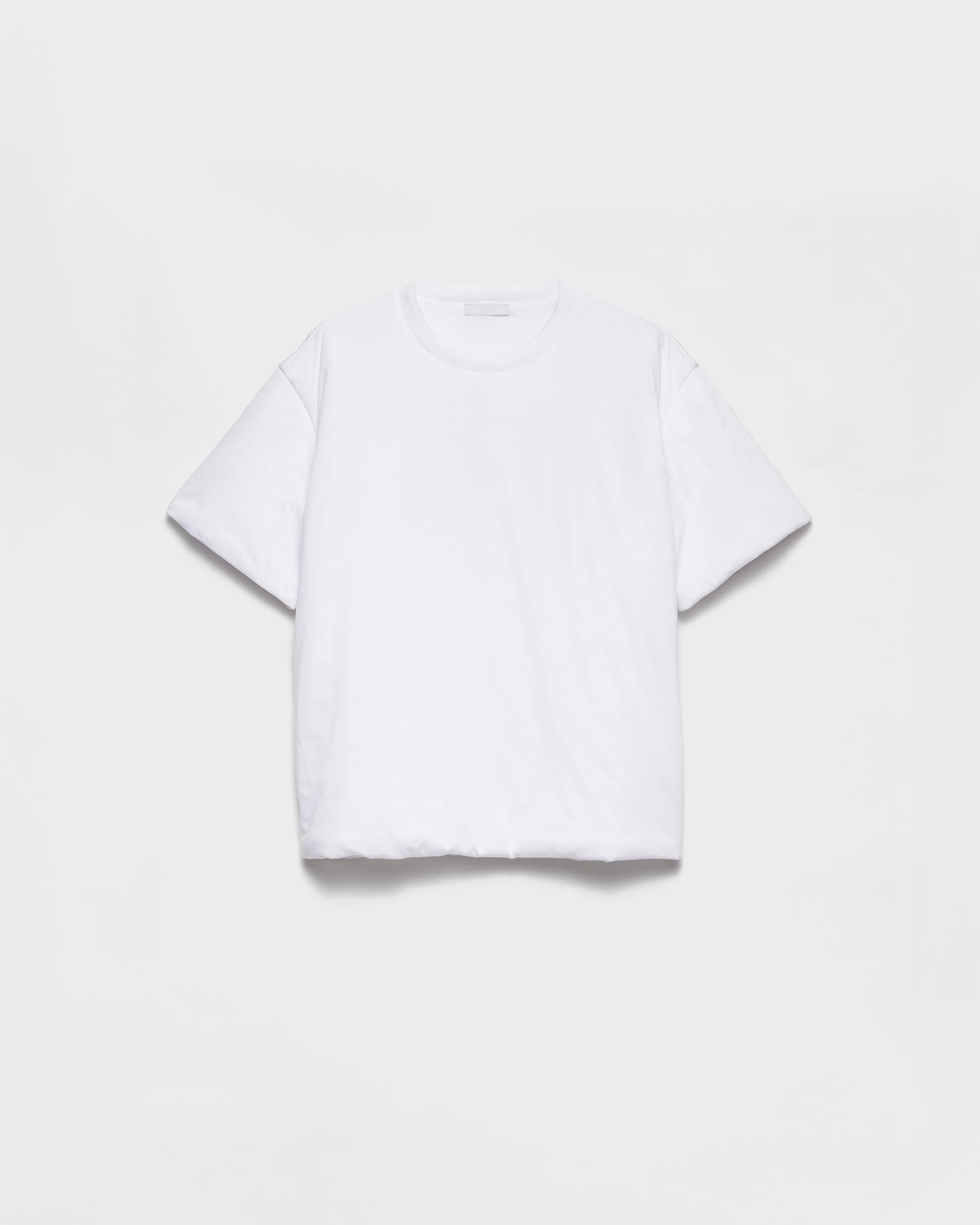 The T-shirt is reinterpreted with an innovative, minimalist design that reveals the versatile and contemporary character of a wardrobe classic. The garment made of padded cotton acquires a three-dimensional effect with distinctive style. - Product code: UJN956_15AZ_F0009_S_OOO - Short sleeves - Ribbed knit crew-neck - Straight hem - Conceptual triangle logo and sartorial label - Length: 68 cm, Size: M - Garment padded with wadding - Imported - The model is 191 cm tall and wears a size 48 Height: 68cm MATERIALS Main material: 100% cotton