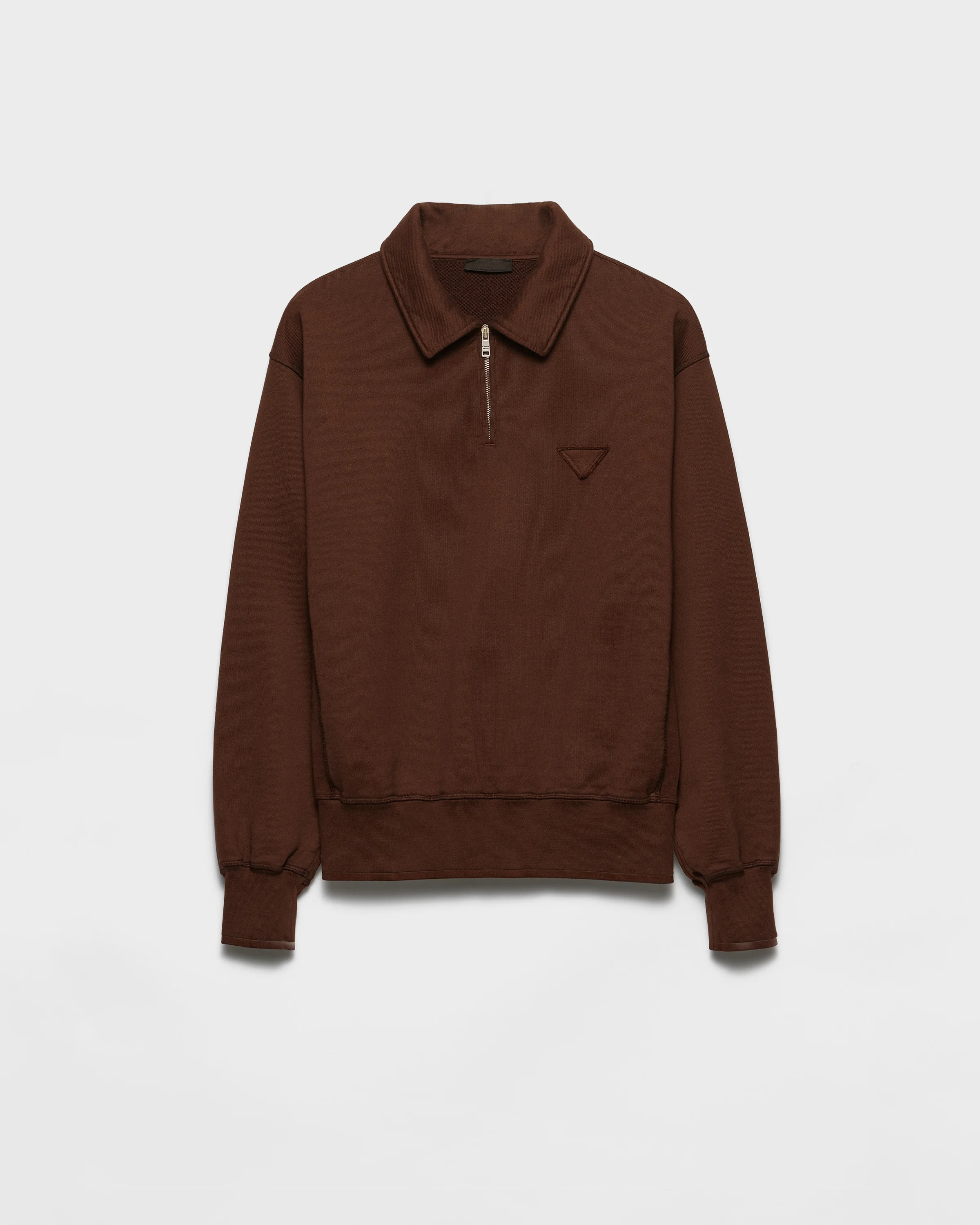 Minimalism and sport are combined in the design of this polo shirt with a contemporary and refined style. The sleek garment made of cotton fleece is decorated with the tonal triangle logo. - Product code: UJL55C_1YFT_F0324_S_OOO - Boxy fit - Long sleeves - Ribbed knit cuffs and hem - Half-zipper closure - Fabric triangle logo - Length: 68 cm, Size: M - Imported - The model is 189 cm tall and wears a size 48 Height: 68cm MATERIALS Main material: 100% cotton