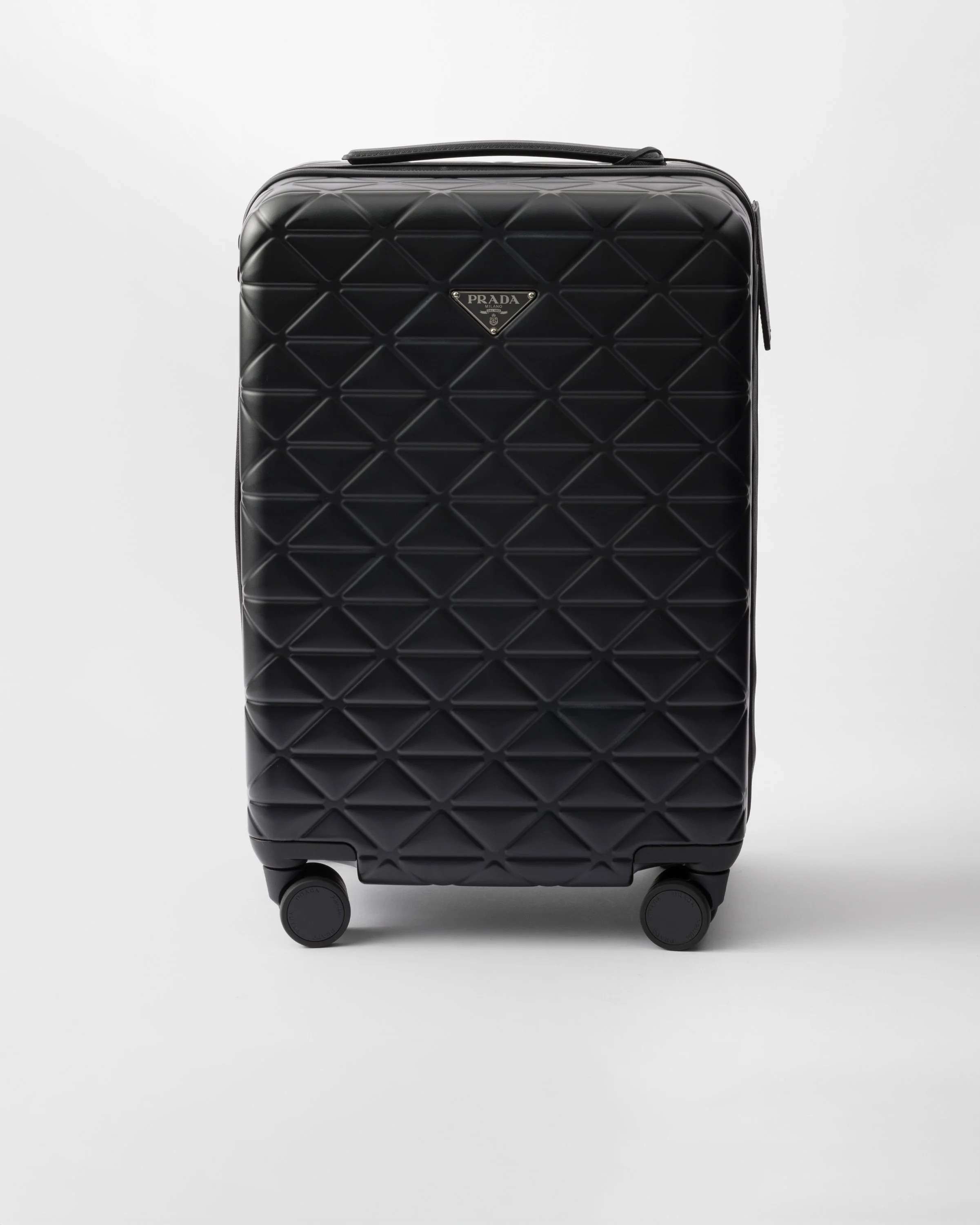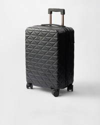 Sleek lines and details define this trolley with an elegant, functional style, made of polycarbonate. The four-wheeled design is enriched with a geometric pattern inspired by the iconic Symbol motif. - Product code: 2VQ006_2C0N_F0002_V_OOT - Leather handles - Enameled metal triangle logo on the front - Zipper closure with TSA combination lock - Removable leather name tag - Telescopic handle on the back - Internal compartment with zipper and compartment with elasticized straps - Logo-print Re-Nylon lining - Four wheels - Cabin size - Imported Height: 56cm Width: 35cm Length: 23cm MATERIALS Main material: Polycarbonate